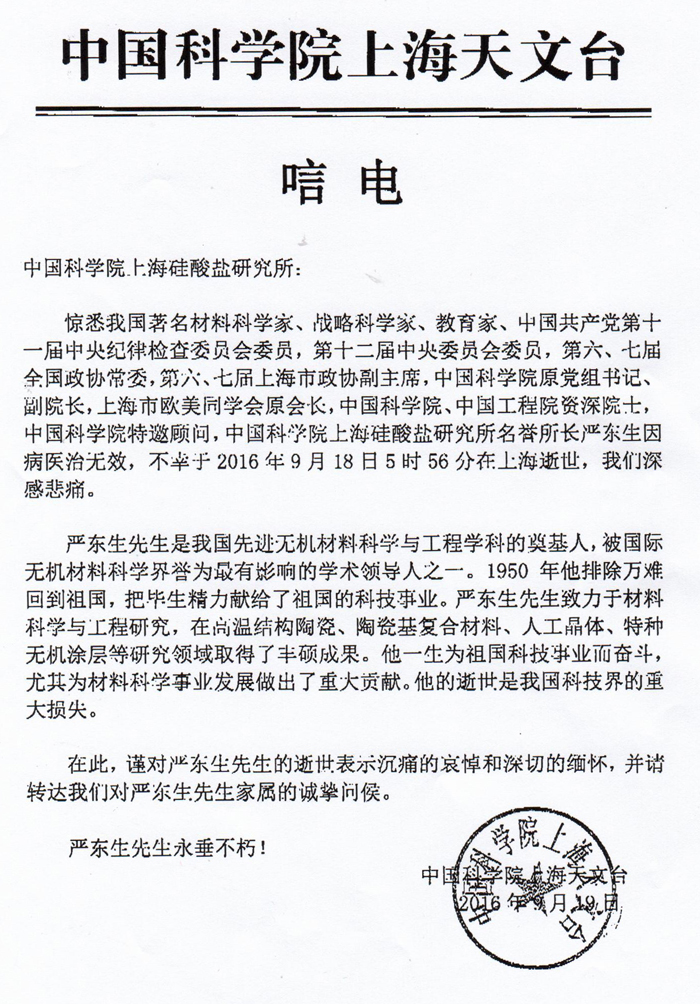 中国科学院上海天文台致唁电