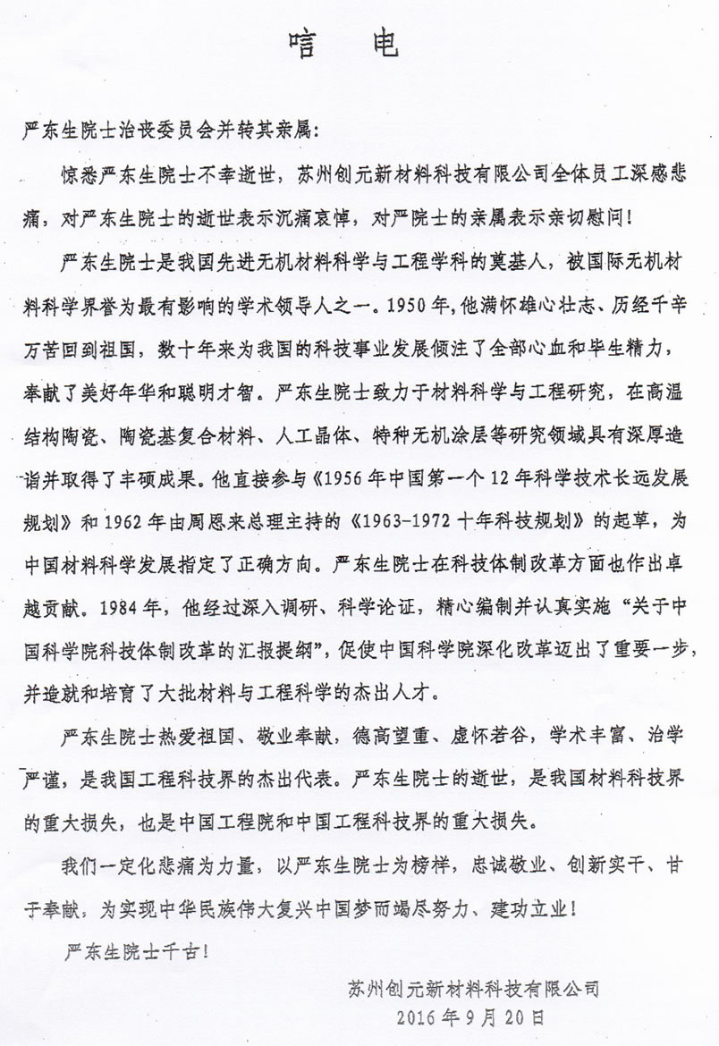 苏州创元新材料科技有限公司致唁电