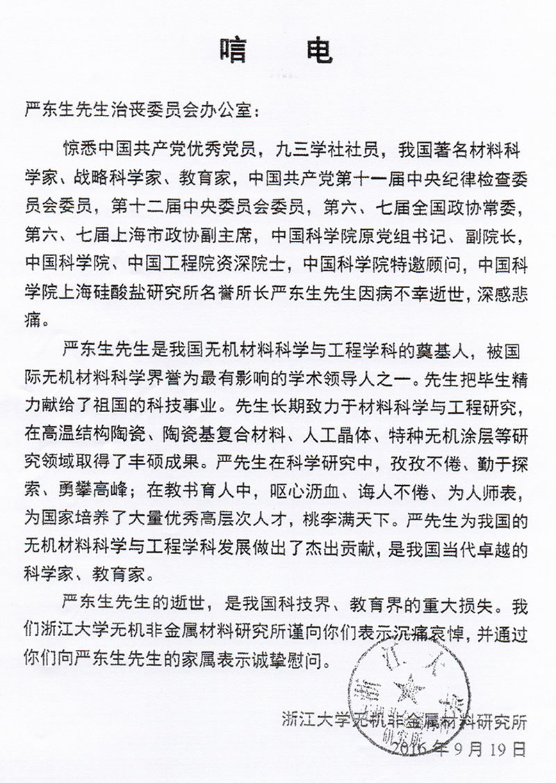 浙江大学无机非金属材料研究所致唁电