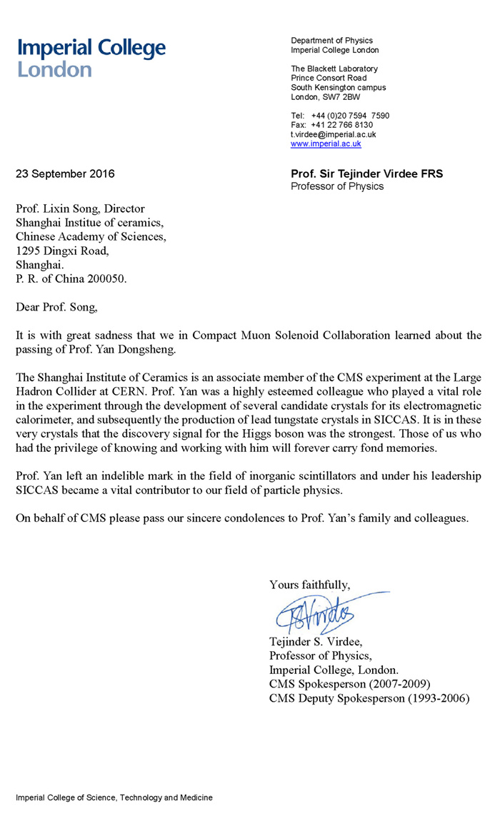伦敦帝国学院Tejinder S. Virdee教授致唁电