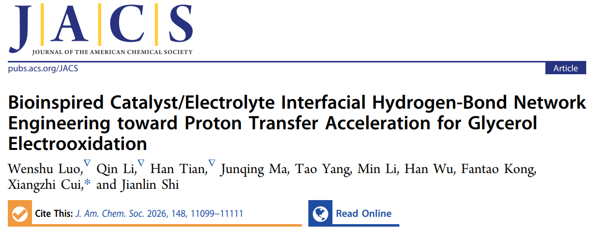 该研究工作以“Bioinspired Catalyst/Electrolyte Interfacial Hydrogen-Bond Network Engineering toward Proton Transfer Acceleration for Glycerol Electrooxidation”为题发表在Journal of the American Chemical Society上(2026, 148, 10, 11099–11111,DOI:10.1021/jacs.5c22753)。第一作者为2021级硕博生罗雯姝、2021级硕博生李勤、田汉助理研究员,通讯作者为崔香枝研究员,研究工作得到了施剑林研究员的悉心指导。研究工作得到了国家自然科学基金、上海市国际合作项目、东方英才项目、上海市自然科学基金和清洁能源利用国家重点实验室的资助和支持。