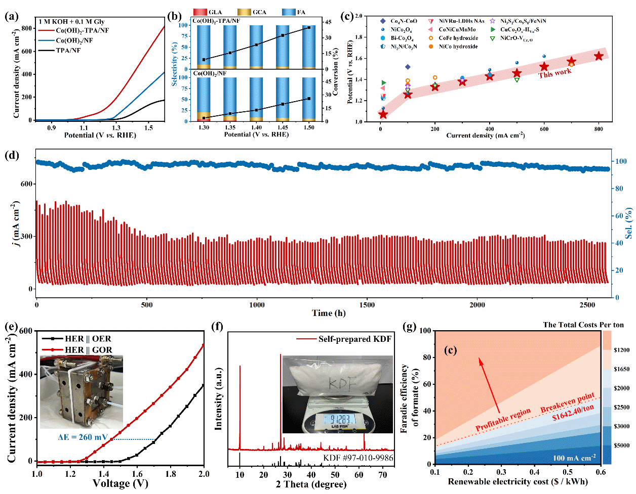 受酶促质子中继的启发,该研究提出了一种配体诱导的界面工程策略,用以重构Co(OH)2双电层内的氢键网络。通过使用对苯二甲酸(TPA)作为仿生配体,成功加速了质子转移动力学,同时促进了晶格羟基活化,实现了高效的质子脱嵌。所得界面修饰催化剂在甘油电氧化制甲酸盐反应中表现出优异的性能,在1.6 V电压下电流密度高于800 mA cm-2,实现了95%的甲酸盐选择性,稳定性超过2600 h,性能优于同期报道的其他工作。