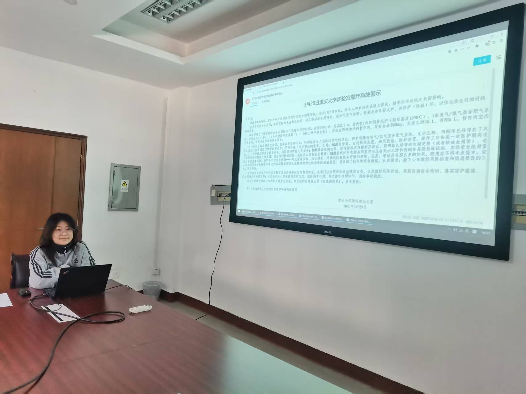 新进组成员代表张煜婕领学了中国科学院上海硅酸盐研究所最新安全通告《2026年3月20日重庆大学实验室爆炸事故警示》。