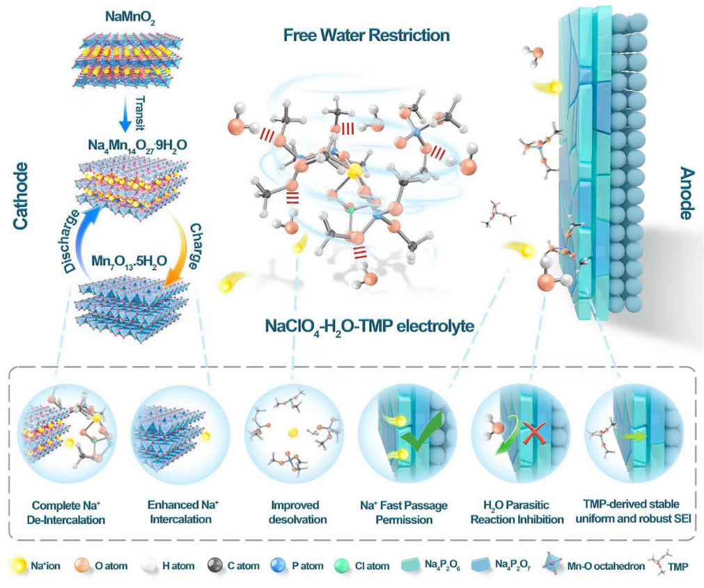 在钠离子电池研究中,团队进一步提出磷酸键合高氯酸(PBP)电解液超结构设计,通过诱导形成焦磷酸钠型超离子导体界面层,有效限制自由水分子与电极的直接接触,从而拓宽电化学稳定窗口至3.2 V。同时,该界面层构建了高效的离子传输通道,显著提升Na⁺迁移效率。基于该电解液体系,NaMnO₂正极实现198.21 mAh g⁻¹的高比容量,全电池能量密度达到82.31 Wh kg⁻¹,并在低温条件下仍保持良好的电化学性能,显示出优异的环境适应性。相关研究以“Phosphate Bonded Perchloric Superstructure Enables Energy‐Dense and Ultra‐Stable Aqueous Sodium‐Ion Batteries”为题发表于Advanced Materials。加拿大滑铁卢大学刘众一和中国科学院大连化学物理研究所张跃斌副研究员为此论文共同第一作者,上海硅酸盐所支键研究员、辽宁师范大学李国辉教授和加拿大滑铁卢大学/宁波东方理工大学陈璞院士为通讯作者。