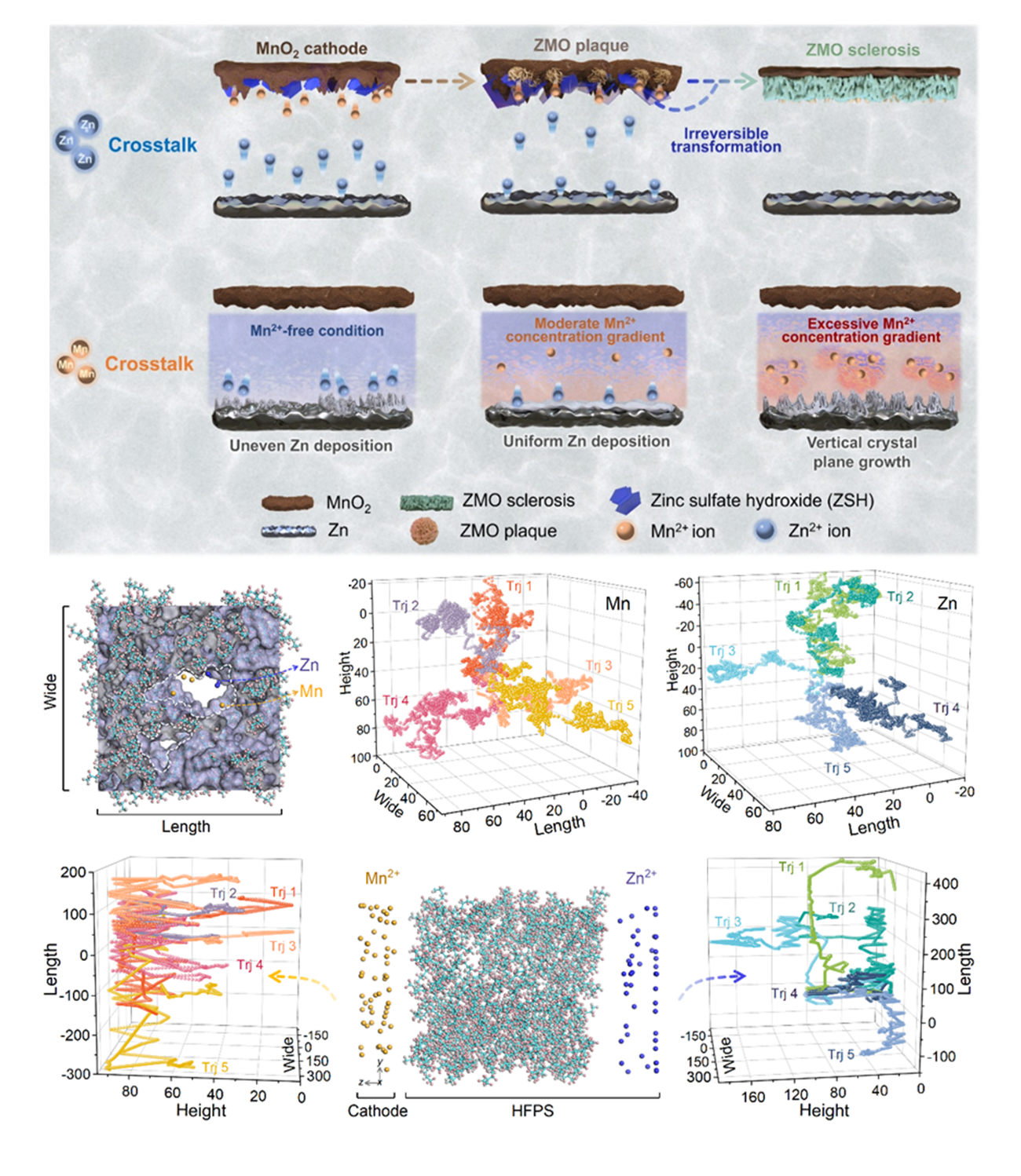 图4.锌锰二次电池内离子串扰效应示意图以及HFPS中离子迁移轨迹