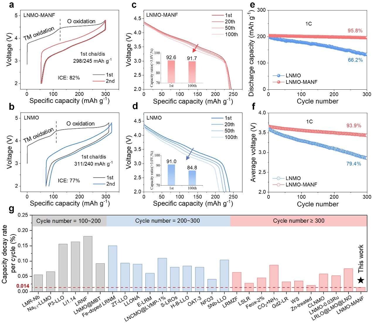 钴金属因其在调节电荷分布和稳定晶体结构方面的重要作用,长期被视为高镍正极材料实现优异电化学性能不可或缺的元素。然而,钴资源稀缺、价格高昂,推动业界加快对低钴甚至无钴正极材料的研发。研究发现,无钴高镍材料在充放电过程中容易出现局部电荷分布不均,导致晶格收缩与拉伸应变,从而诱发结构相变并逐步积累劣化效应,成为制约其性能稳定性的关键难题。通过第一性原理计算与原位表征技术的协同应用,研究团队发现Fe离子具有自适应电荷补偿(charge compensation)效应,基于此设计并合成了新型二元高镍正极材料LiNi0.85Fe0.15O2。该材料有效抑制了高镍体系中常见的结构相变问题,展现出218 mAh g⁻¹的高初始容量,并彻底避免了无钴正极中常见的Li⁺/Ni²⁺反位缺陷,为无钴高镍正极材料的理性设计提供了新思路。相关成果以题为“Adaptively-generated multivalent active sites suppress destructive phase transition in high-nickel layered oxide cathodes”发表在材料领域期刊Materials Today上。上海硅酸盐所博士研究生李毅为该论文第一作者,厦门大学杨勇教授、上海硅酸盐所周钲洋副研究员和刘建军研究员为共同通讯作者。
