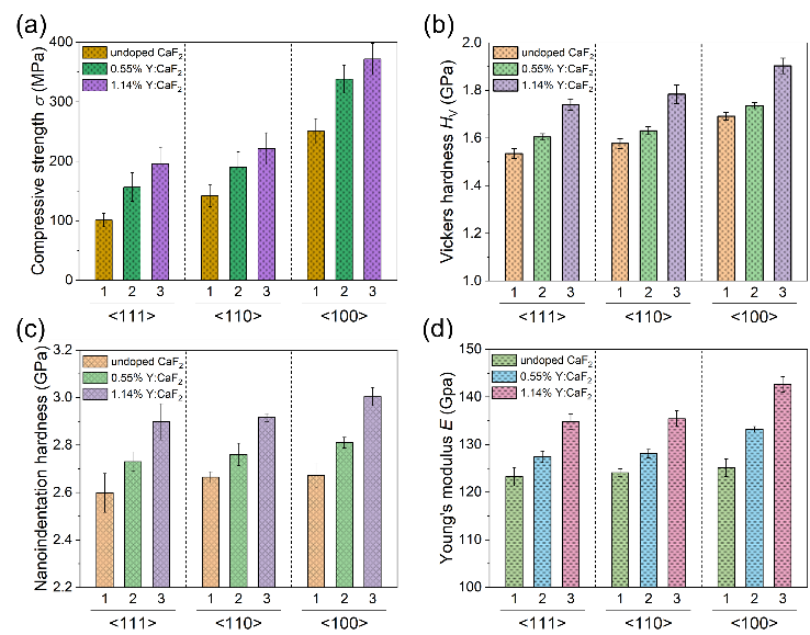 图1、 CaF2晶体压缩强度、硬度和杨氏模量的各向异性