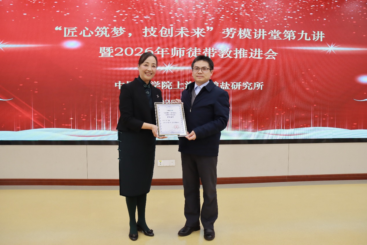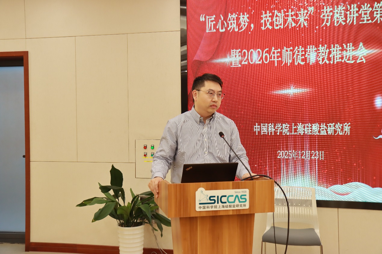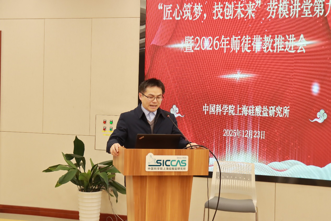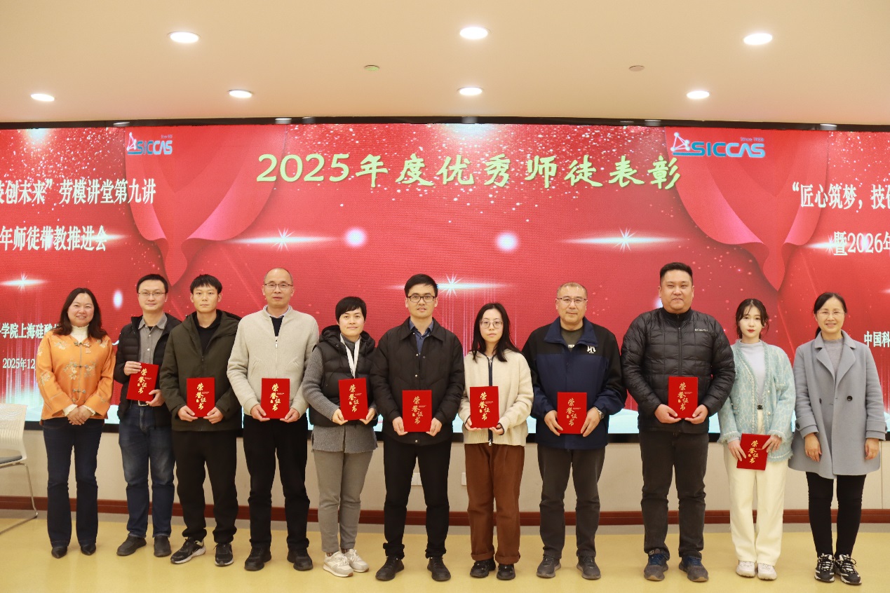 刘学超宣读了2025年度优秀师徒表彰决定,所工会委员章俞之,古陶瓷与工业陶瓷工程研究中心主任、党支部书记曹逊,特种无机涂层研究中心党支部书记孟佳,新材料中试研发中心党支部书记袁兰英,机关三党支部书记、安全与保障管理办公室副主任宋桂兰,前沿基础研究部副主任、关键陶瓷材料全国重点实验室第一党支部书记林翰为16对优秀师徒颁奖。