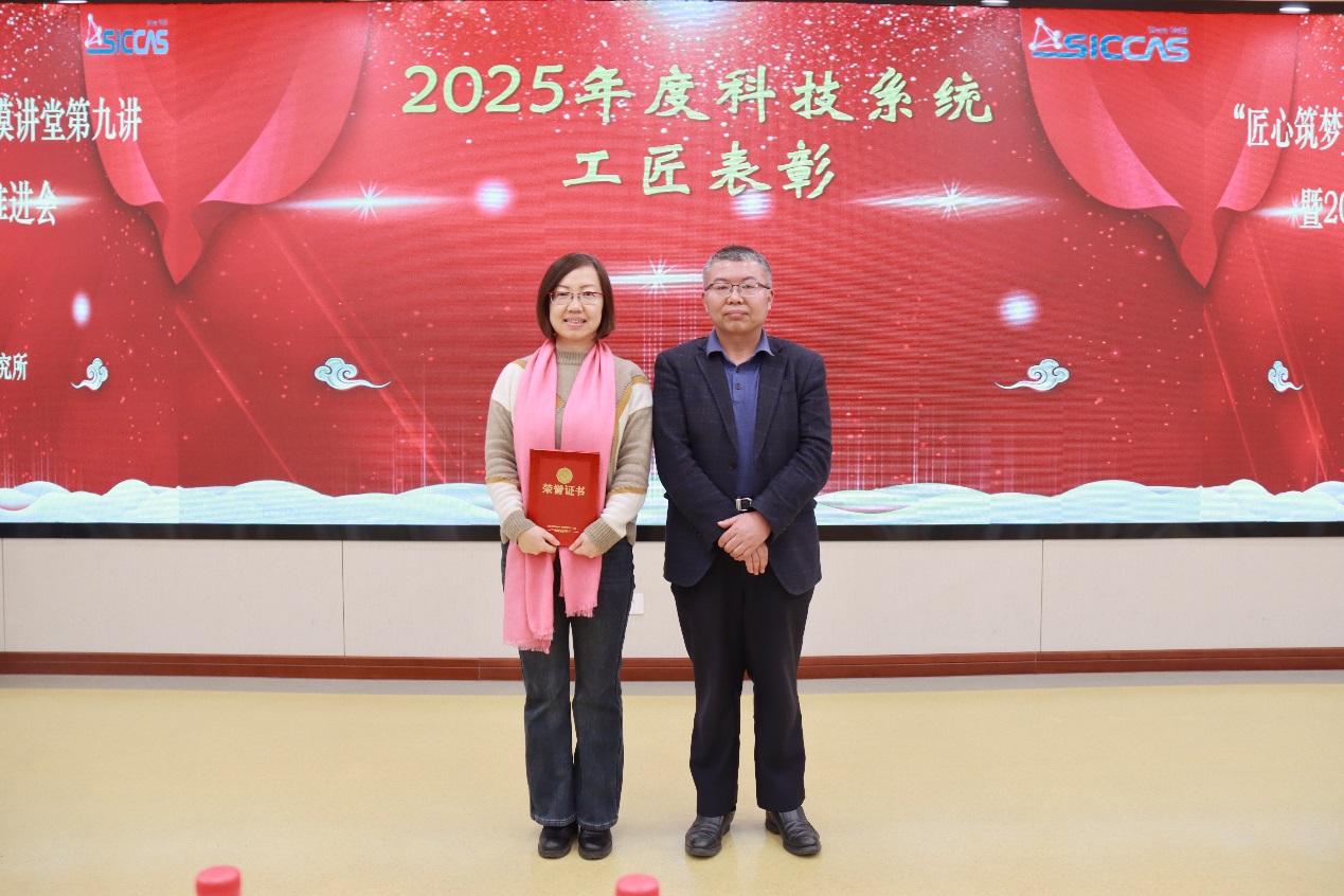 2025年以来,研究所职工岗位建功成绩突出,获得了多项荣誉。结构陶瓷与复合材料工程研究中心何平正高级工程师荣获2025年度上海工匠,此前研究所已有3位职工获此殊荣。信息功能材料与器件研究中心范晓荣正高级工程师荣获“上海市科技系统工匠”。吴云涛研究员所在的工作团队荣获“上海市科技系统职工创新工作室”。2016年上海工匠获得者、结构陶瓷与复合材料工程研究中心陈忠明正高级工程师,2021年上海工匠获得者、新材料中试研发中心吴泓澍高级工程师先后为“上海市科技系统工匠”和“上海市科技系统职工创新工作室”颁奖和授牌。