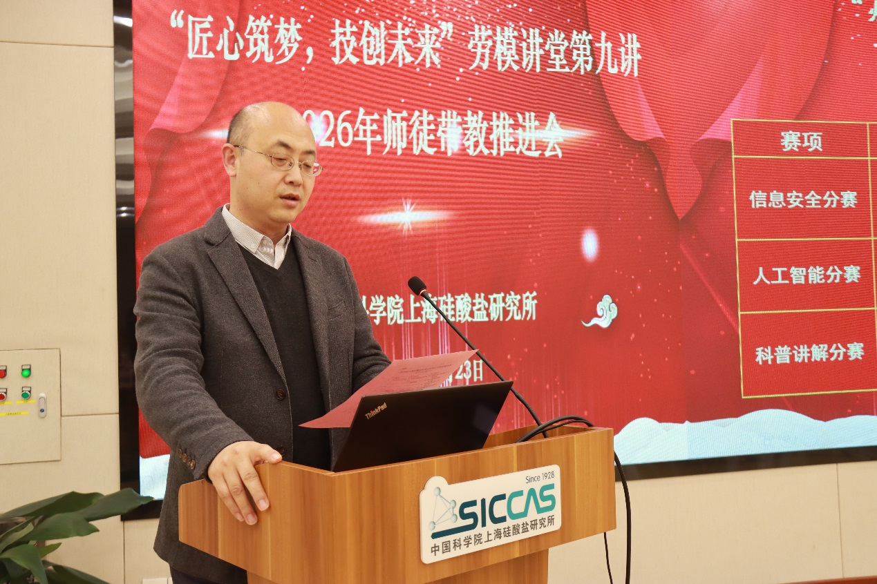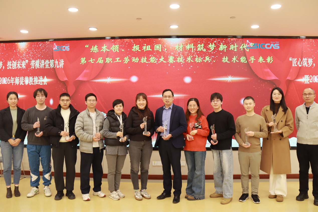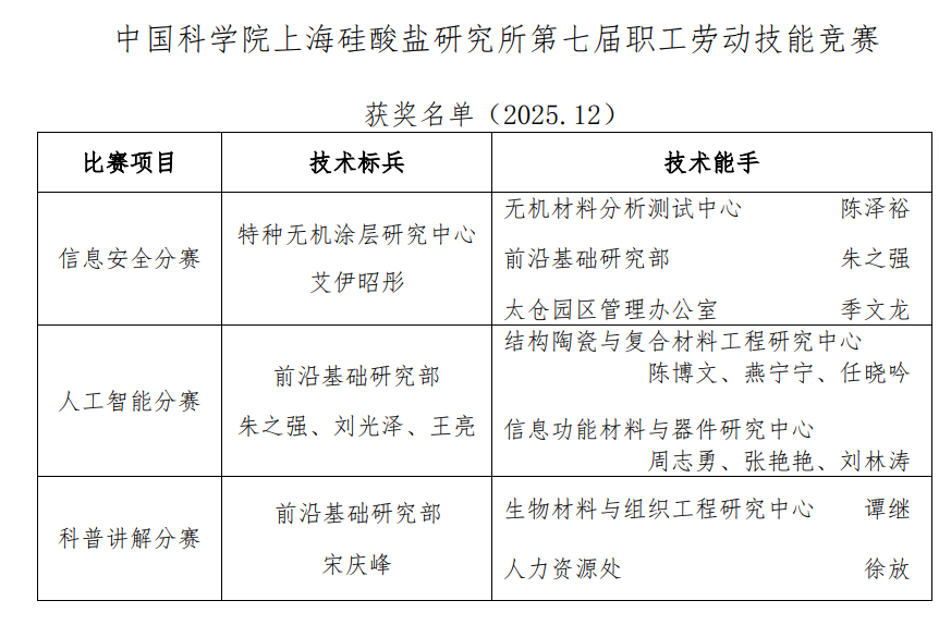 上海硅酸盐所于2025年11月组织了以“炼本领、报祖国,材料筑梦新时代”为主题的第七届职工劳动技能大赛,分别举办了信息安全分赛、人工智能分赛、科普讲解分赛3个专项比赛,贺天厚宣读了第七届职工劳动技能大赛技术标兵、技术能手表彰决定。陆贝妮、结构陶瓷中心党支部副书记何平为第七届职工劳动技能大赛技术能手获奖者颁奖,吴尔愉为第七届职工劳动技能大赛技术标兵获得者颁奖。