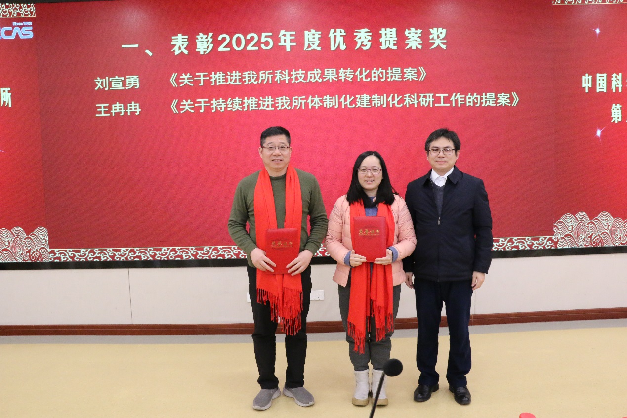 会上对2025年度职工代表优秀提案、优秀体育协会、优秀协会会员及优秀分工会进行了表彰。纪委书记周田华、所长苏良碧、党委书记王东分别为获奖集体与个人颁奖。