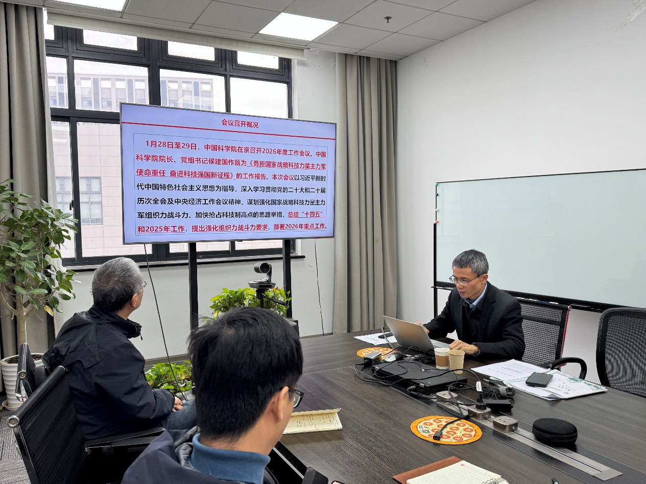毛朝梁领学了中国科学院2026年度工作会议精神。强调在“十五五”期间紧紧围绕抢占科技制高点核心任务,着力强化国家战略科技力量主力军的组织力战斗力。在开局之年,要以组织实施“十五五”规划为主线,紧密对接国家战略需求和部署中心重点工作,聚焦主责主业,把会议精神转化为推进科技创新与攻坚克难的强大动力。