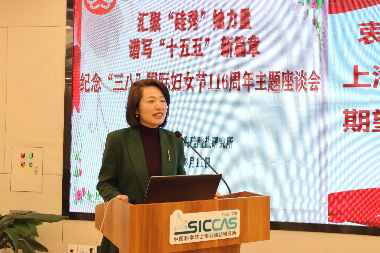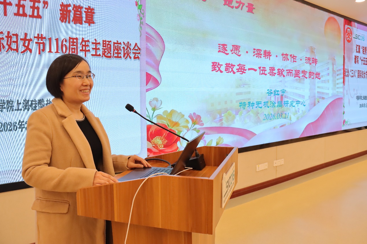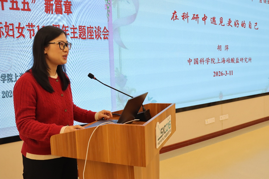 3月11日上午,中国科学院上海硅酸盐研究所妇女工作委员会召开纪念“三八”国际妇女节116周年主题座谈会。本次会议以“汇聚‘硅秀’她力量,谱写‘十五五’新篇章”为主题,深入学习贯彻中国科学院2026年度工作会议精神,表彰先进、分享经验、凝聚共识,进一步激发全所女性科技工作者的创新活力与奋斗热情。上海市科技妇工委主任何晌艳,全国妇联执委、中国科学院上海分院妇委主任、中国科学院上海药物研究所研究员柳红,嘉定区妇联主席姚芳,上海硅酸盐所纪委书记、党委委员周田华,党委委员、所务委员、党委办公室主任、所办公室主任毛朝梁,工会主席孙伟嬿,以及所妇委委员、女职工代表、女研究生代表等60余人出席会议。会议由妇委副主任袁兰英主持。